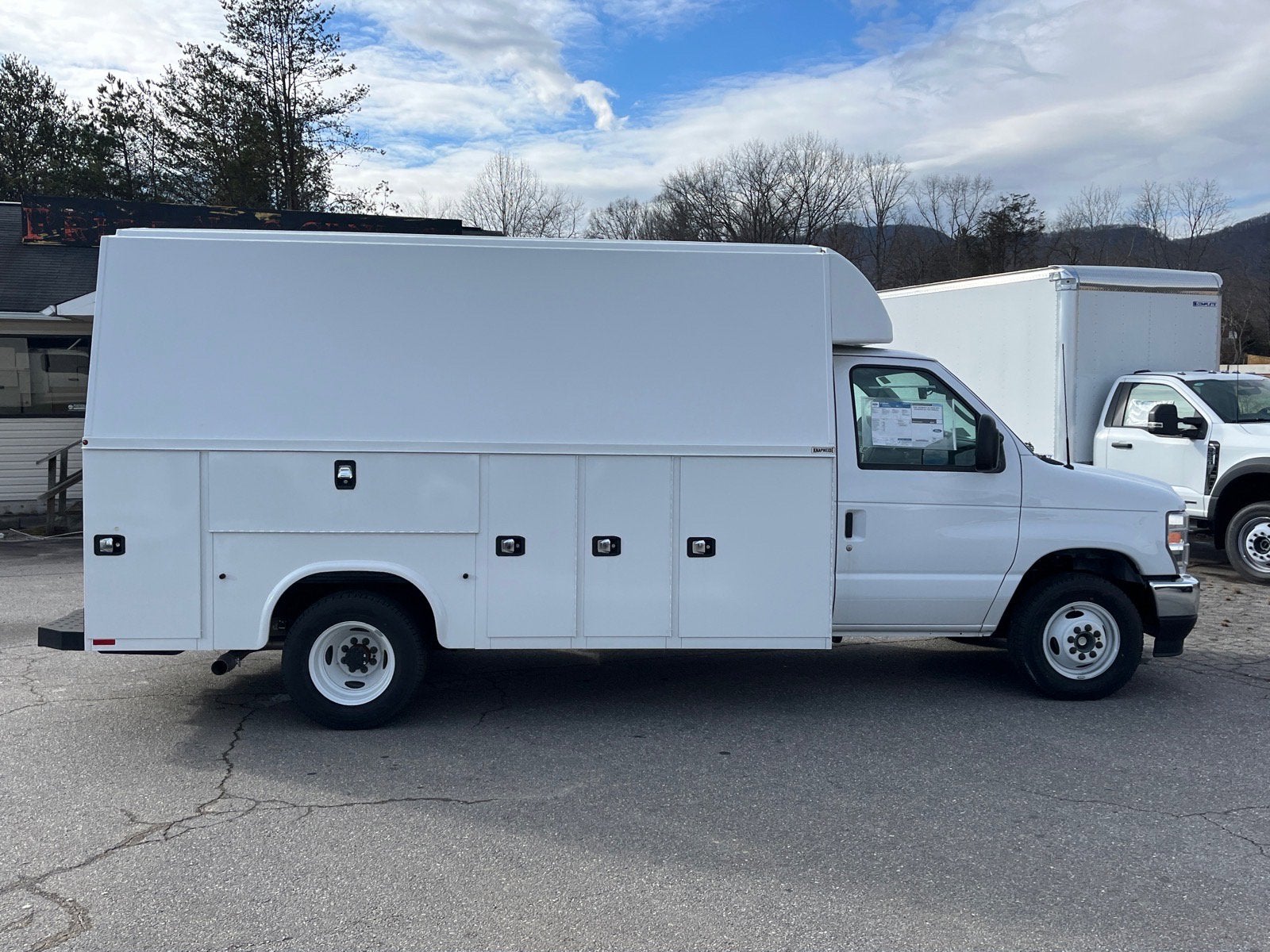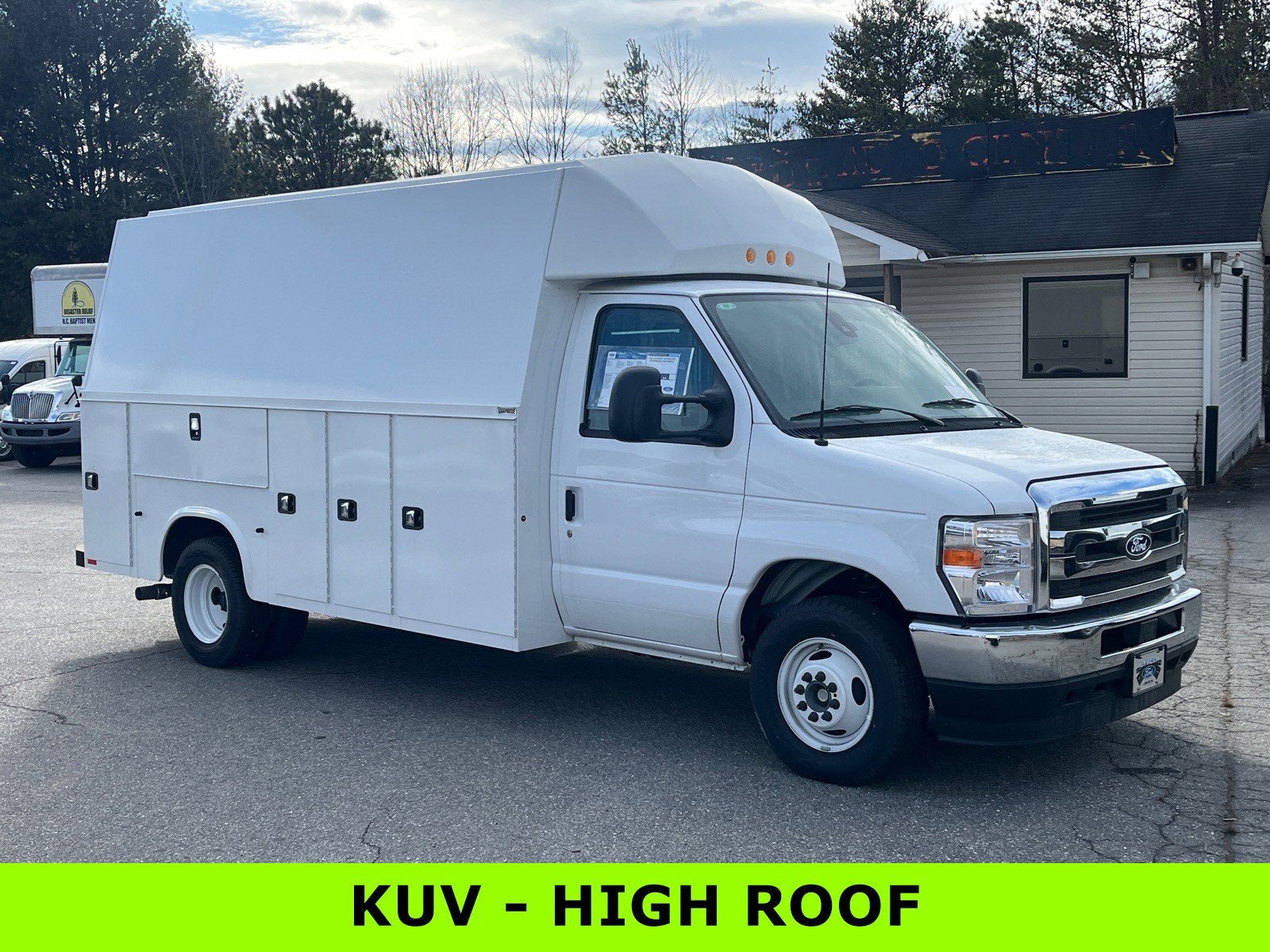 Oxford White 2026 Ford E-350SD Cutaway RWD 6-Speed Automatic with Overdrive 7.3L V8 **KUV HIGH ROOF**, 110V Power Inverter, Chrome Grille, Class I Trailer Towing Package, Front Chrome Bumper, High Series Exterior Upgrade Package, Order Code 780A, Power Equipment Group, Remote Keyless Entry, SecuriLock Passive Anti-Theft System (ePATS).